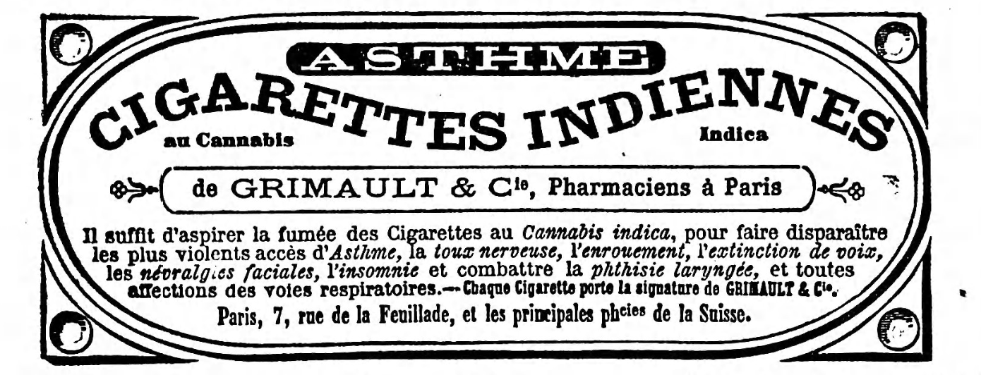 Pub utilisé dans les journaux à la fin du 19ᵉ siècle pour vendre des cigarettes à base de Cannabis pour combattre l'Asthme